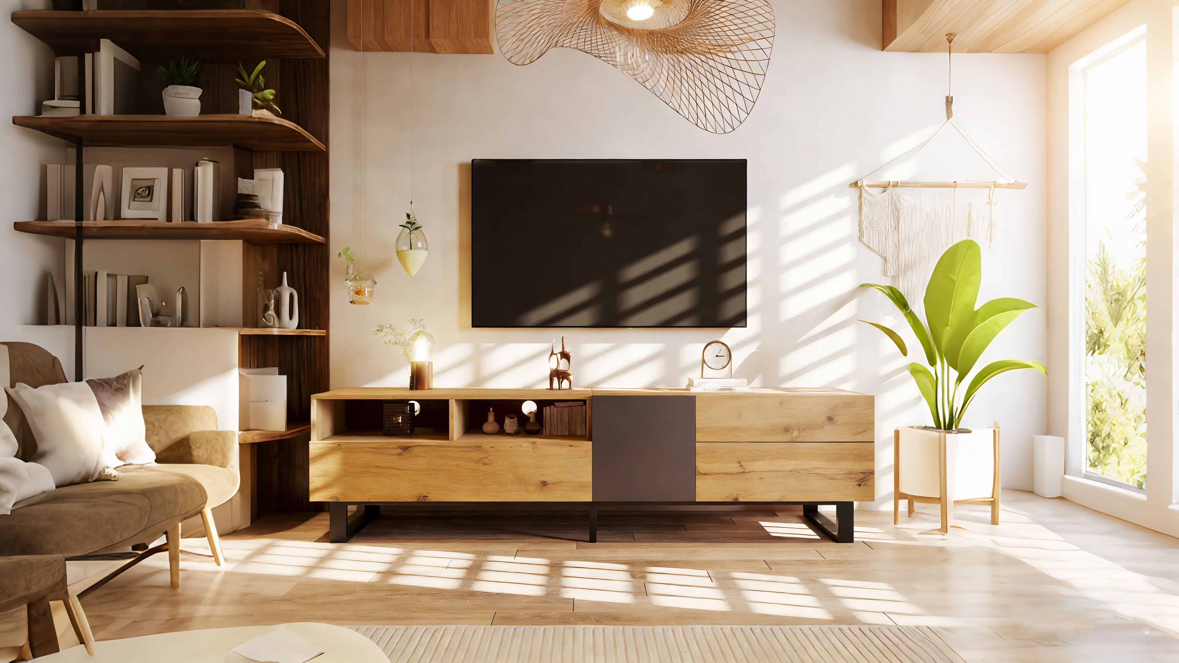 Light wood and black contrasting floating TV cabinet